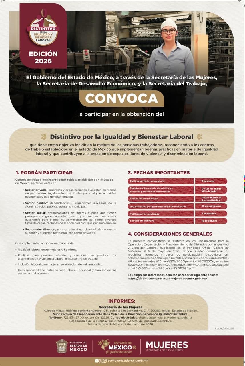 TOLUCA, Estado de México.– El Gobierno del Estado de México, que encabeza la Maestra Delfina Gómez Álvarez, emitió la convocatoria para participar por el “Distintivo para la Igualdad y Bienestar Laboral” en su edición 2026, un reconocimiento a los centros de trabajo establecidos en la entidad que implementan buenas prácticas en materia de igualdad laboral, que contribuyen a la creación de espacios libres de violencia e incorporan la perspectiva de género en sus planes y estrategias.